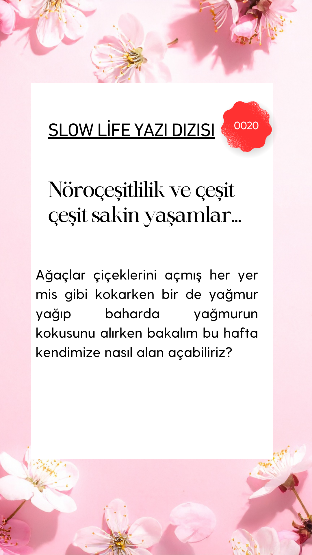 Ağaçlar çiçeklerini açmış her yer mis gibi kokarken bir de yağmur yağıp baharda yağmurun kokusunu alırken bakalım bu hafta kendimize nasıl alan açabiliriz?